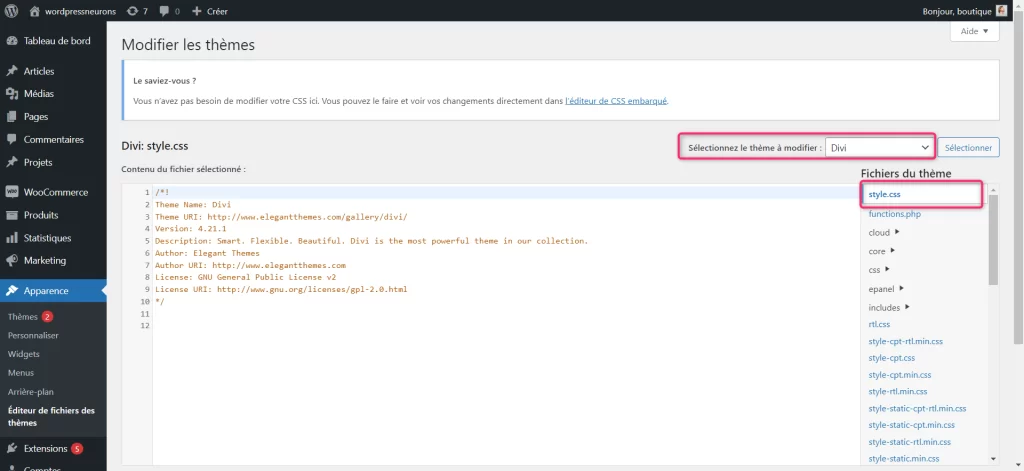 Pour venir modifier le fichier style.css, vous avez la possibilité de le faire de deux façons :