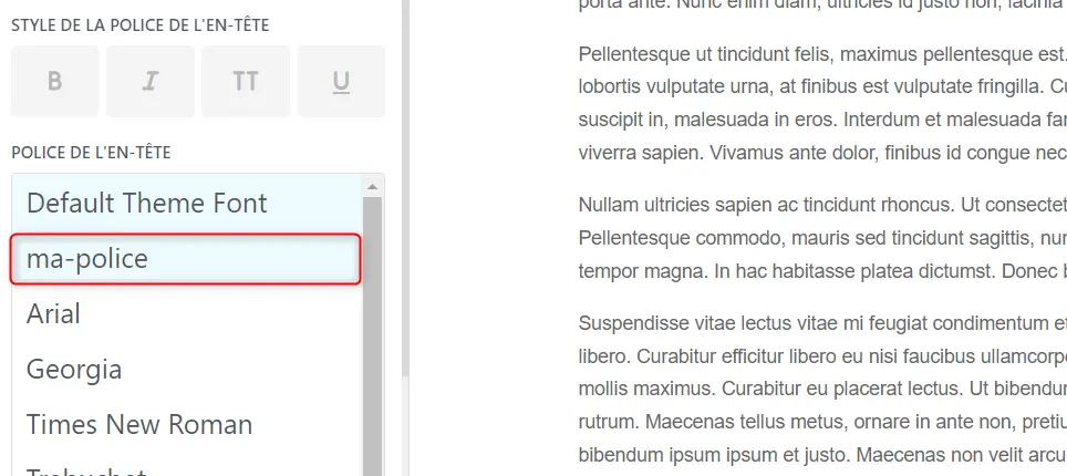 Une fois ajoutée, votre police sera disponible dans tous les modules textes, il vous suffit de la sélectionner dans le menu déroulant des polices. Pour la supprimer, cliquez sur l’icône « poubelle ». Si vous souhaitez la retrouver sur votre serveur, elle est stockée dans le dossier suivant : /wp-content/uploads/et-fonts.